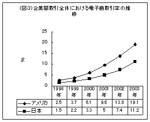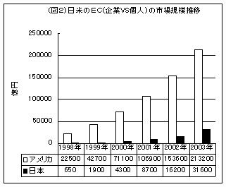 またアメリカでは企業VS企業において取引額で20兆円、商取引全体における2.5%がECで行われています。企業VS個人は2兆5500億円、0.4%となっており、日本はアメリカに3年遅れていると言われています。