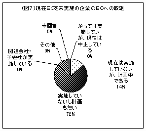 県内企業へのアンケート結果を見てみると、県内の企業で現在ECを未実施の企業は、今後もECを実施する予定が無いが72%(図7)、「なぜECを行わないのか」の回答として「必要性を感じない」が25%、「社内の体制が整っていない」が27%と半数を占めています。(図8)上記(1)インフラの整備・・の中でも述べていますが、大半の県内企業が今後生き残っていくためには早急な意識改革が必要と思われます。その為には常に最新の動向、技術にアンテナをはり、それらを積極的に取り込む決断と行動力、そして情報発信、情報交換の場となる集まり(同業種、業種を越えた、)の設立、参加が不可欠です。