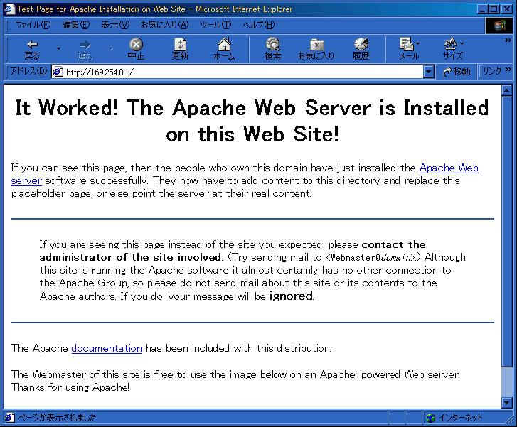 Linux側でApacheを起動した後、クライアント側のブラウザで確認します。上の図のように表示されればOKです。もしApacheのデフォルト画面が表示されない場合は、httpd.confファイルをエディタで開きPortをチェックしてみます。8080であれば 80に変更します。(Port 80)