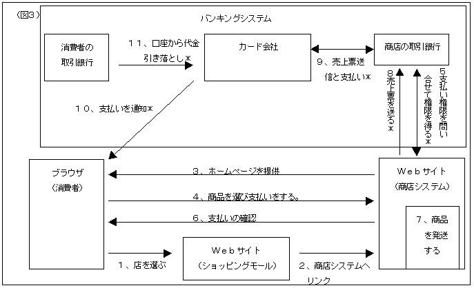 電子クレジットカードを使った時の取引の流れを示します。(図3)