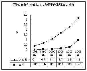 またアメリカでは企業VS企業において取引額で20兆円、商取引全体における2.5%がECで行われています。企業VS個人は2兆5500億円、0.4%となっており、日本はアメリカに3年遅れていると言われています。