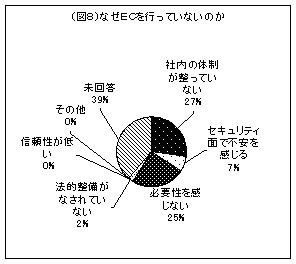 県内企業へのアンケート結果を見てみると、県内の企業で現在ECを未実施の企業は、今後もECを実施する予定が無いが72%(図7)、「なぜECを行わないのか」の回答として「必要性を感じない」が25%、「社内の体制が整っていない」が27%と半数を占めています。(図8)上記(1)インフラの整備・・の中でも述べていますが、大半の県内企業が今後生き残っていくためには早急な意識改革が必要と思われます。その為には常に最新の動向、技術にアンテナをはり、それらを積極的に取り込む決断と行動力、そして情報発信、情報交換の場となる集まり(同業種、業種を越えた、)の設立、参加が不可欠です。