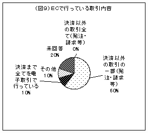 「なぜECを行わないのか」の回答としては上記以外に「セキュリティが不安」7%、といった回答が出ています(図8)。さらにECを行っている企業の取引内容(図9)を見てみると大半が一部の取引しか行っていません。これはECのセキュリティへの不安の為ではないでしょうか。